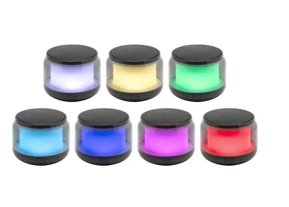 Parlante Bluetooth estéreo. ABS transparente con cubierta de malla metálica por donde se emite el sonido. Botones en color negro. Led que cambia entre 7 colores y 8 modos de luz para elegir. Potencia 3W. Versión Bluetooth: 5.0. capacidad de la batería: 500 mAh. Cable de carga y conexión USB-C en color negro. Presentación en caja de regalo.