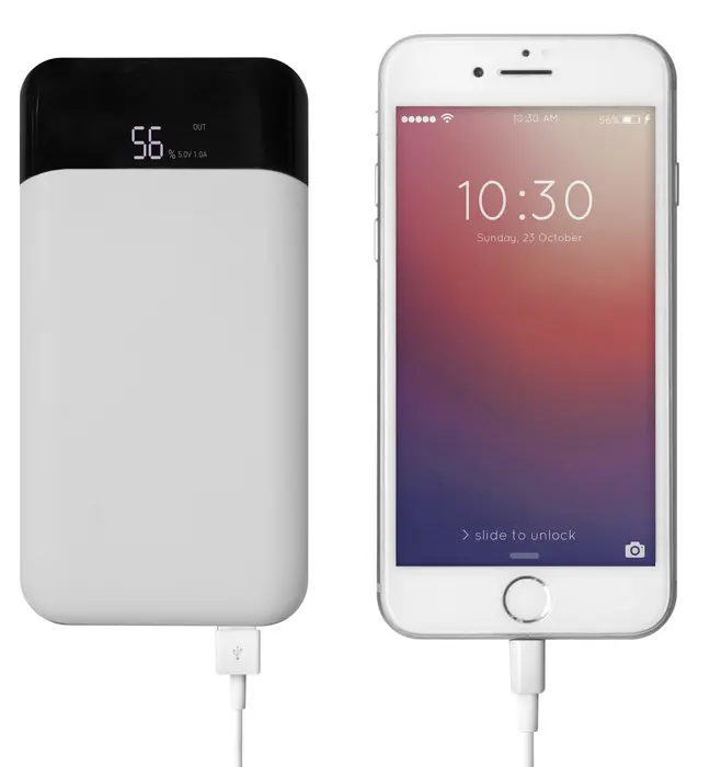 Power Bank Capacidad 8000 mah. Plástico.Con luz led indicador de porcentaje de carga. Entrada USB y mini USB. Presentación en caja de regalo.